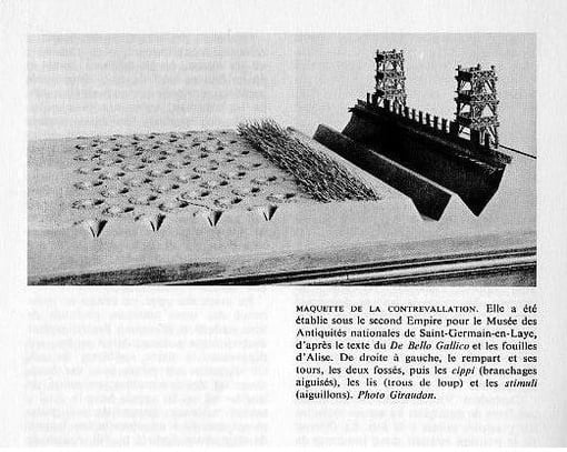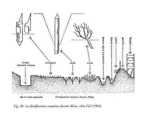 Dans cet espace, César tira deux fossés de quinze pieds de large et d'autant de profondeur ; celui qui était intérieur et creusé dans un terrain bas et inculte, fut rempli d'eau tirée de la rivière. Derrière ces fossés, il éleva une terrasse et un rempart de douze pieds ...