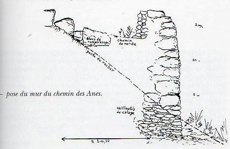 Ce mur est à double parement avec blocage intérieur en tout venant , il fait en moyenne 1.50 m de hauteur et 2 m de largeur ; vu de dessus on distingue encore les trous ayant accueilli des pièces de bois .
